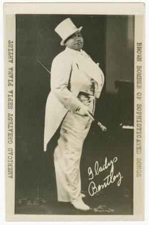 ● Gelatin silver print of Gladys Bentley, circa 1927-45. Taunted as a child for her unfeminine demeanor, the transmasculine performer Gladys Bentley became a star in Harlem, singing and playing piano all night at rent parties and popular nightclubs. Her signature white tuxedo and top hat have become icons of queer self-expression on and off the stage.