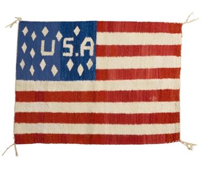 A preview installation currently on view highlights select pieces, including Scholder’s lithograph Indian Contemplating Columbus, an American flag by an unrecorded Navajo weaver, and Cara Romero’s photographic work Dans L’ombre.