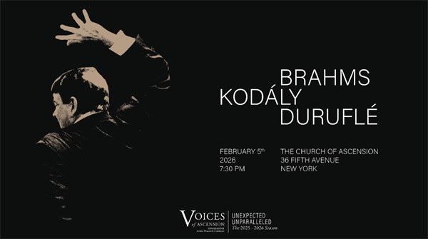Voices of Ascension will present a program of rarely heard choral masterworks by Johannes Brahms, Zoltán Kodály and Maurice Duruflé on Feb. 5 at the Church of the Ascension (36 Fifth Avenue at 10th St. | New York, NY 10011), highlighted by a rare New York performance of Duruflé’s Messe “cum jubilo” with full orchestra.